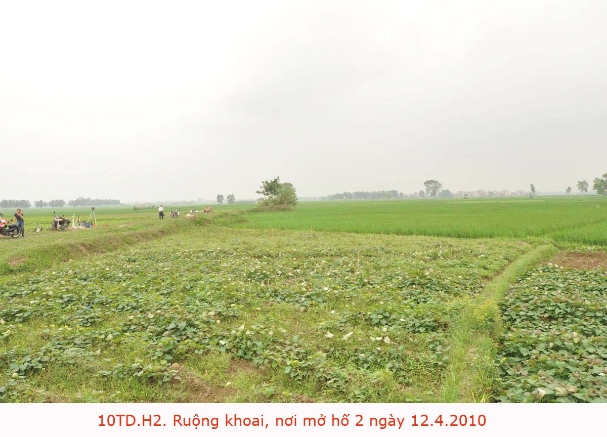Hố 2, cách hố 1 qua mương nước, rộng 100m2 được mở tại ruộng trồng khoai lang, bên cạnh ruộng lúa đang mới làm đòng